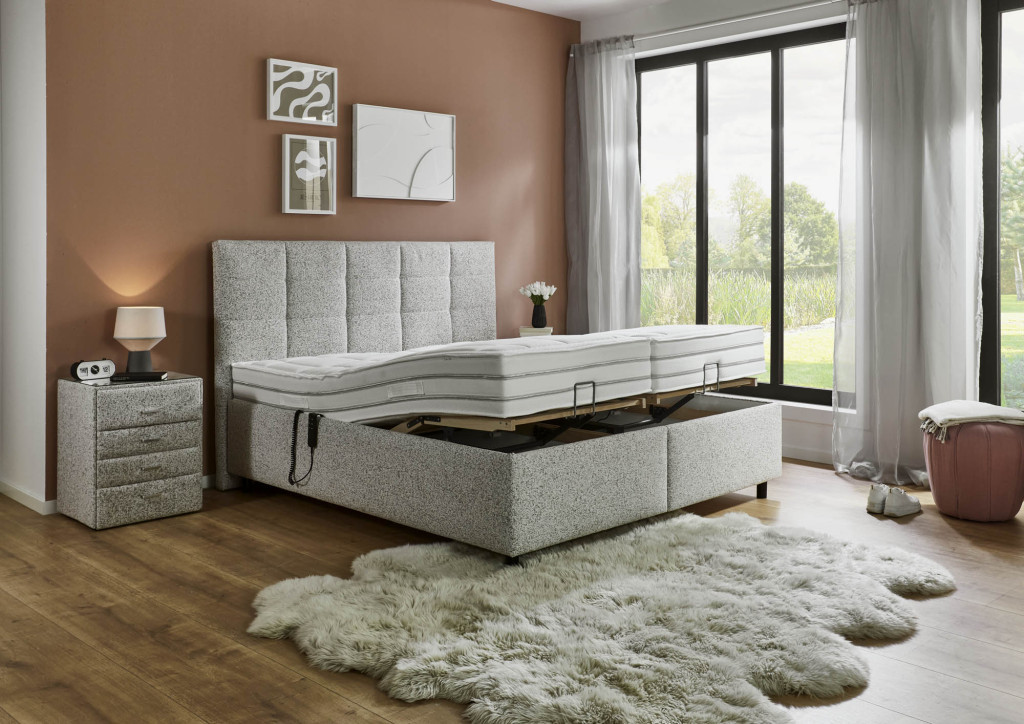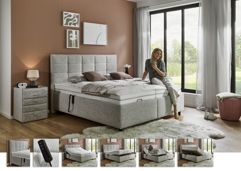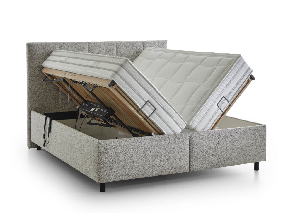 Stoff, Farbe beige, Füße Schwebeoptik, 10 cm, Kopfteil, Rücken unecht, Unterbau, Matratze links 1000-Federn Taschenfederkern-Matratze H2, Matratze rechts 1000-Federn Taschenfederkern-Matratze H3, Bezug Drell, geteilt,Liegefläche 180 x 200 cm, Stellmaß BHT 191/125/215 cm, Liegehöhe 62 cm