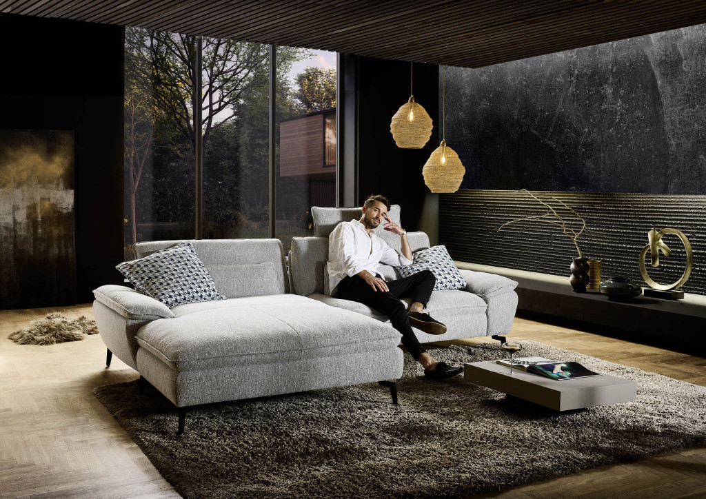 Webstoff, Nutzschicht 100% Polyester, Farbe silver, Rücken echt, Sitz Kaltschaum, Fuß schwarz, Sitzhöhe 46 cm, Sitztiefe 79 cm, bestehend aus: