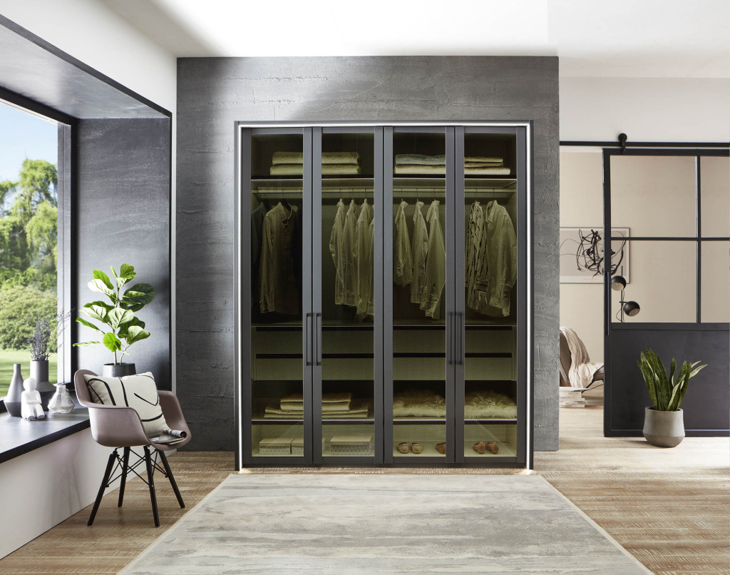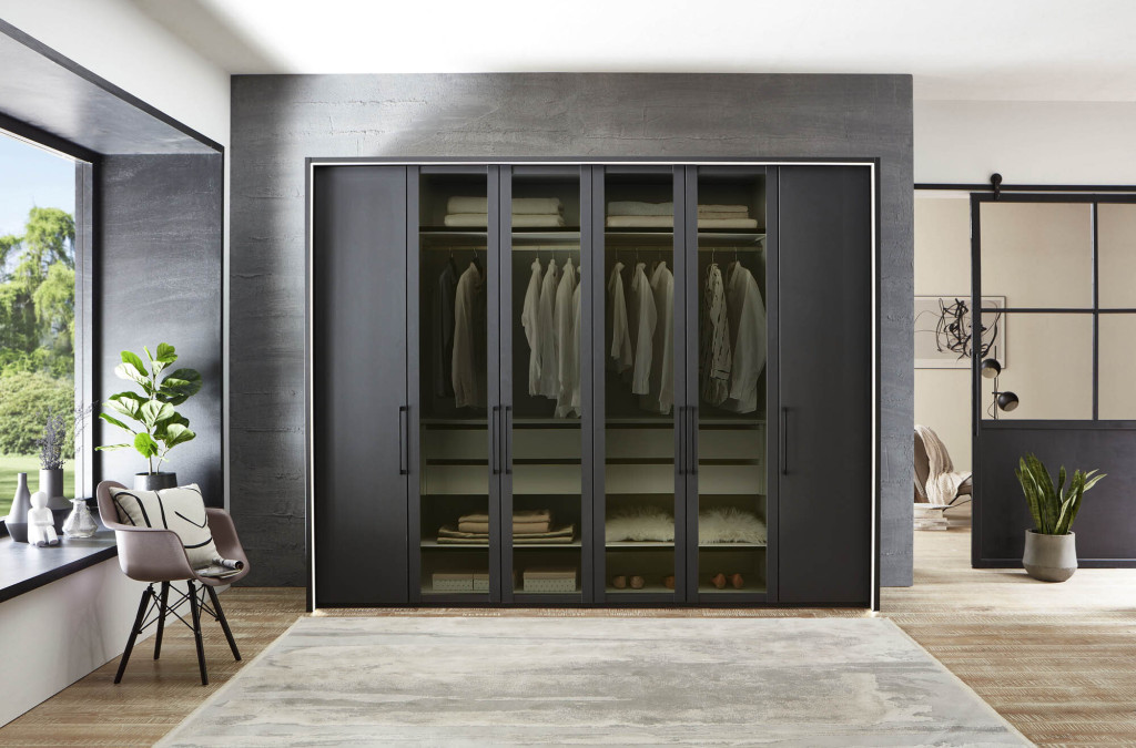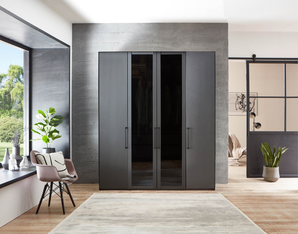 Außentüren graphit-Dekor, mittig Rahmentüren graphit-Dekor in Glas Parsol grau ohne Rauten, Griffe schwarz, ohne Kranzleiste, Türen gedämpft, 6-türig, 4 Glastüren, Aufteilung ca. 47,5/72/72/47,5 cm, BHT ca. 250/216/58 cm