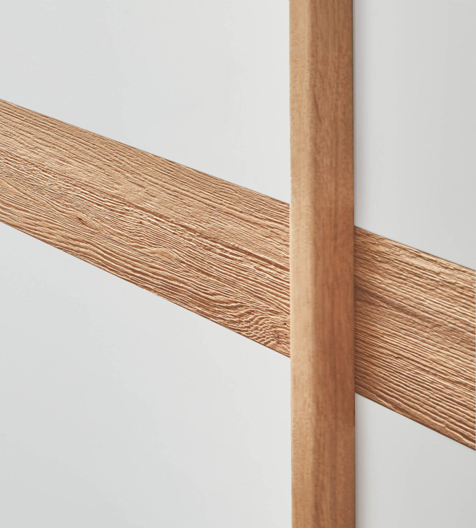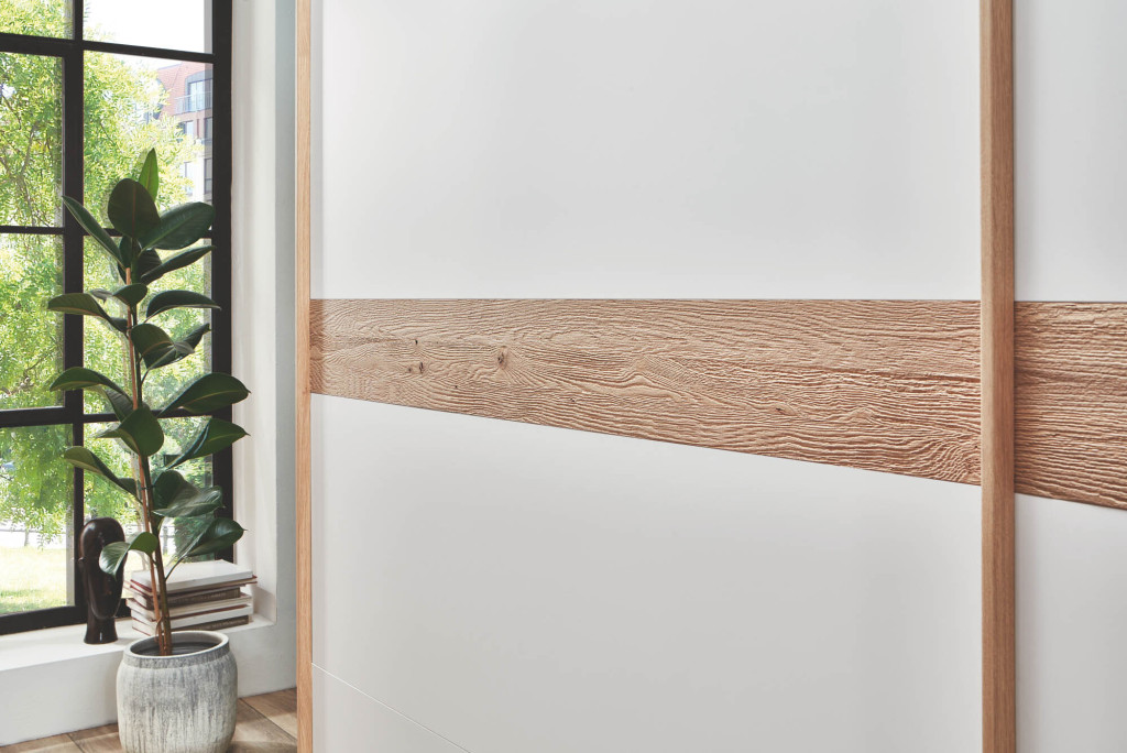 Front mit Bauchbinde, Front Lack weiß, Bauchbinde Wildeiche Riffelholz, Korpus Wildeiche furniert, Griffleisten Wildeiche furniert, 2-türig, mit Dämpfungsbeschlag, Kranzleiste 19mm ohne Beleuchtung, Aufteilung 90/60/60/90 cm, BHT ca. 301/230/68 cm
