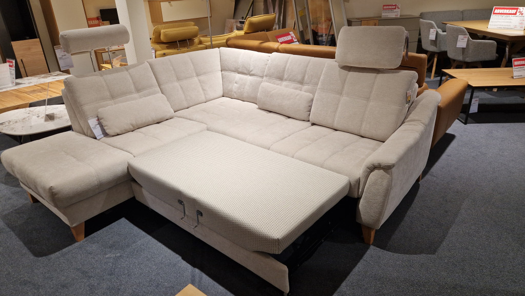 Bezug: Rimini natur, Füße: Massivholz Wildeiche, Sitz: Kaltschaum, Doppelsteppnaht mit Kotrastfaden, Inklusive: Anstellhocker, aufklappbar, mit Sitztiefenverstellung, mit Querschläfer-Funktion, Premium Kopfstütze Inklusive Kopfstütze und 2x Nierenkissen