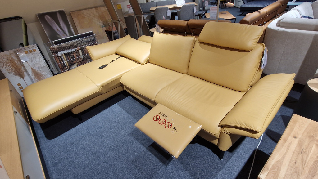 Leder Vivre yellow, Rücken echt, Sitz: F2 mittel, Füße Alu schwarz, Canape gerade mit motorischer Verstellbarkeit bis zur abgeschrägten Liegeposition,