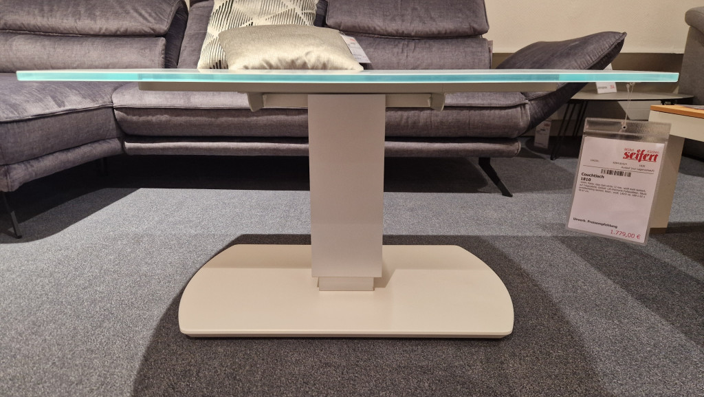 -GWM, Platte: Glas Opti-white 12mm. Weiß matt lackiert, auf Trägerplatte, Gestell: Lift-Mechanik-Fußauslöser, Säule perlsilberfarbig lackiert, Beizt.: weiß,L/B/H ca. Q100/62/47-67 cm.
