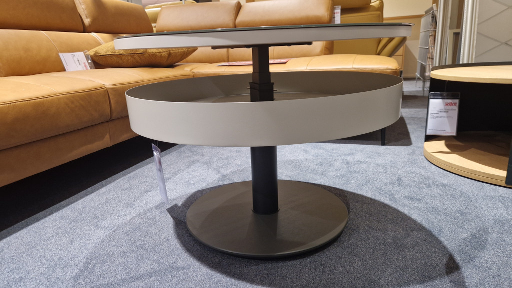 -UGR-SGR, Platte: Glas Satinato RAL 7022 umbragrau hinterlackiert auf Trägerplatte Dekor RAL 7044 seidegrau, Gestell: Hydra-Lift-Mechanik in Athrazit-Metallic lackiert, Ablagekasten in StahlRAL 7044 Seidenmatt lackiert, Bodenplatte in Athrazit-Metallic in Schliffoptik lackiert, Rollen, Beizt.: umbragrau/Seidenmatt, rund, Durchm. ca. 75cm., H=44-62cm.