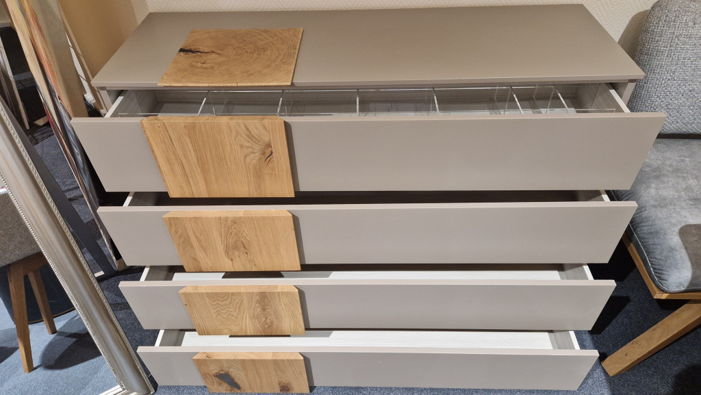 Farbe: Fango matt / Wildeiche natur Teilmassiv, 4 Schubkästen, Maße ca. B/H/T 121/84/41 cm.