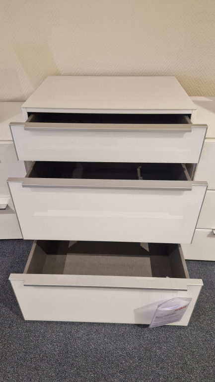 Frontfarbe: Polarweiß, Korpusfarbe: Polarweiß, Griffausführung: Bügelgriff, Grifffarbe: chrom, Schubkasteninnenfarbe: Leinenoptik Twist, Fußfarbe: schwarz, mit 3 Schubkästen,
