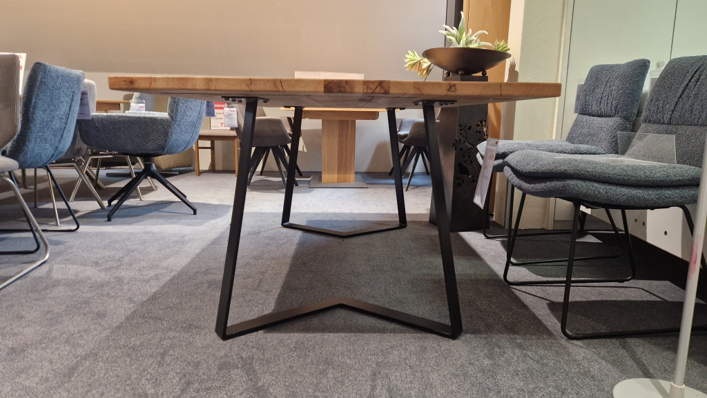 Typ: 3003, Platte Balkeneiche natur massiv strukturgehobelt, Wachseffekt-Oberfläche, Design-Kufe Eisen schwarz, ca. 200 x 100cm.