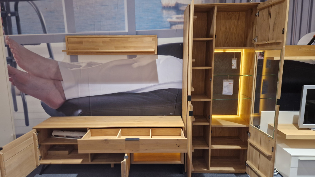 Wildeiche massiv blanco, mit Granit-Steinrückwand, Bestehend aus Lowboard und VitrineInklusive Beleuchtung und Steinrückwandca. B/H/T 285/203/45 cm.