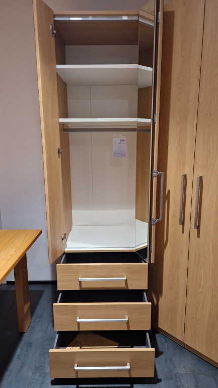 Korpusdekor: Eiche hell, Innendekor: glattweiß, Frontdekor: Eiche hell, Griff: S-Stangengriff,