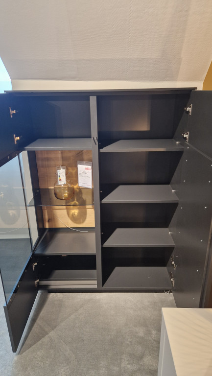 Deutsche Markenqualität, Ausf. Lack seidenmatt Weiß / Wildeiche massiv gebürstet Natur geölt, Nr. HB42, mit Sockel, Inklusive: Beleuchtung, Elektro-Staufach,B/H/T ca. 105,6/147,8/41,2 cm.
