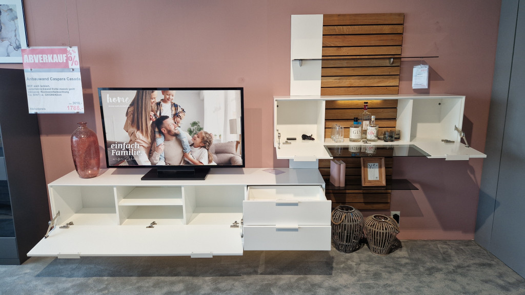 MDF weiß lackiert,Lamellenrückwand Eiche massiv geöltInklusive: RückwandbeleuchtungB/H/T ca. 320/206/42 cm.