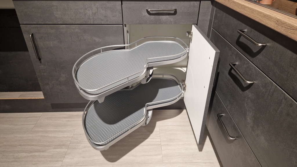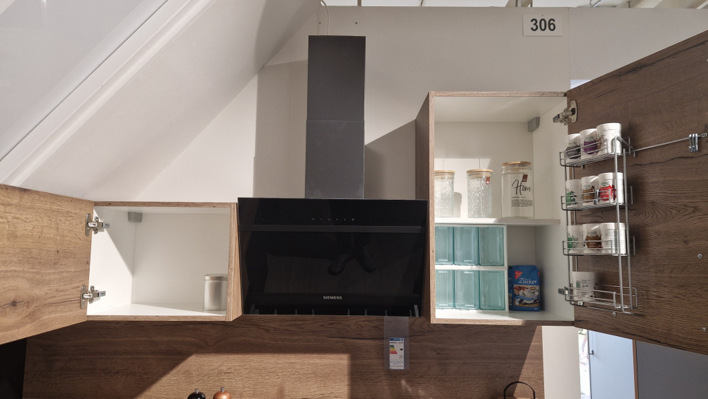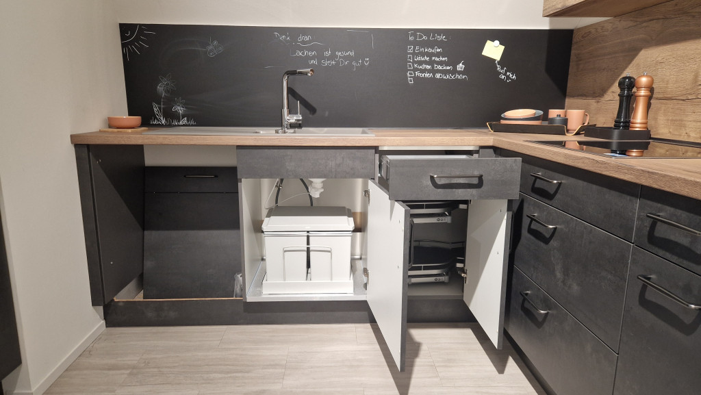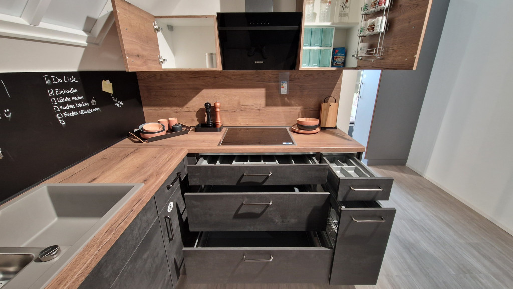 Front: Schwarzbeton Nachbildung, Griff: Metallgriff schwarz gebürstet, Korpusfarbe: Schiefergrau, Sockelfarbe: Schwarzbeton Nachbildung, Arbeitsplattendekor: Eiche Havanna Nachbildung, Sockelhöhe: ca. 150mm.,