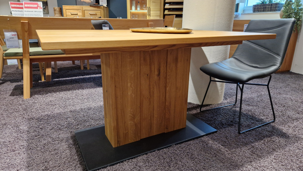 Rustikale Asteiche Hartwachsöl natur geschliffen, feste Tischplatte,ca. 130 x 95 cm., H=76 cm., Plattenstärke ca. 3 cm.,Holzsäule mit Granitnodenplatte schwarz