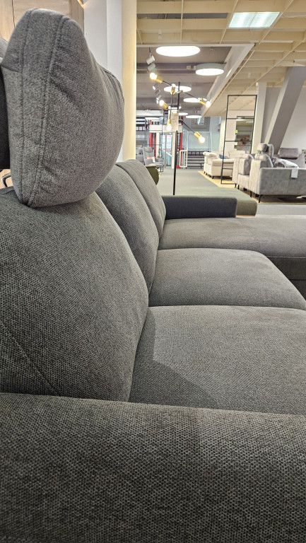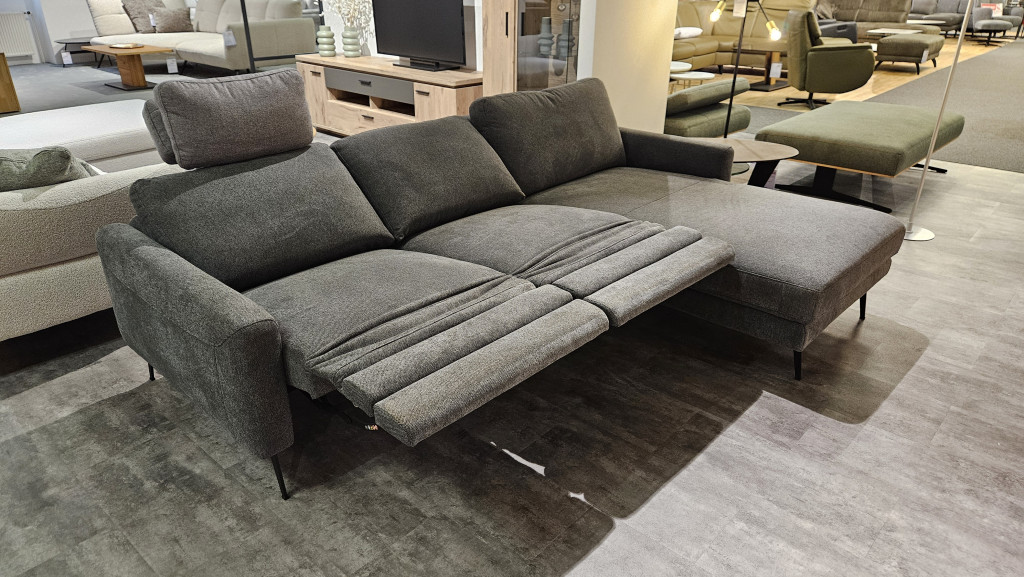 Bezug Clever 65 grey, PG. II, Sitzkomfort: Taschenfederkern, Armlehne -M, Fuß -MF3 schwarz, best. aus: 1x Art. 10251M, 1,25L(70) relax m. motor, 1,25-Sitzer mit AL. links, mit motorischen Relaxfunktion, 1x Art. 10250, 1,25(70), 1,25-Sitzer ohne Armlehne, 1x Art. 602390, LR, Longchair mit AL. rechts, 2x Art. 902355, Kopfstütze 55, mit Rastomat ca. 256 x 177 cm.