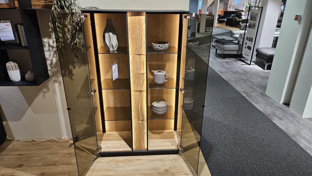 Deutsche Qualitätsarbeit, Kernesche massiv, Oberfläche gebürstet und anthrazit gebeizt, 2 Glastüren, 1 Spaltholzapp., ca. B=98 H=162 T=44 cm. Inklusive: Beleuchtung