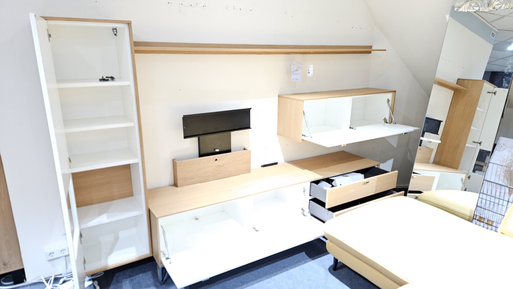 Front/Korpus: Lack weiß,Korpus/Rückwand/Wandboard: Eiche SandGriff: H4 chrom glänzendca. B/H/T 318,2 x 161,6 x 49,2 cm