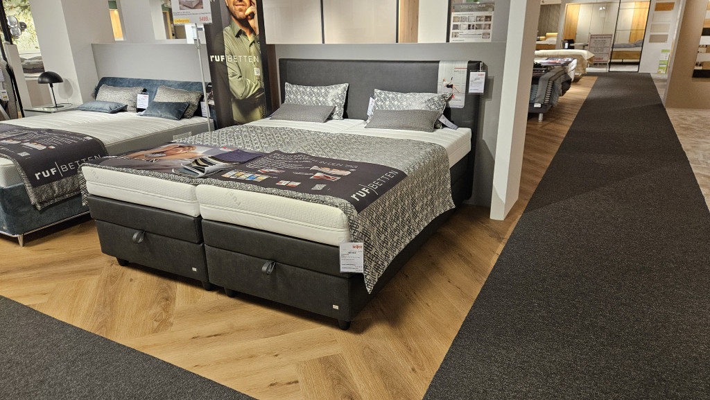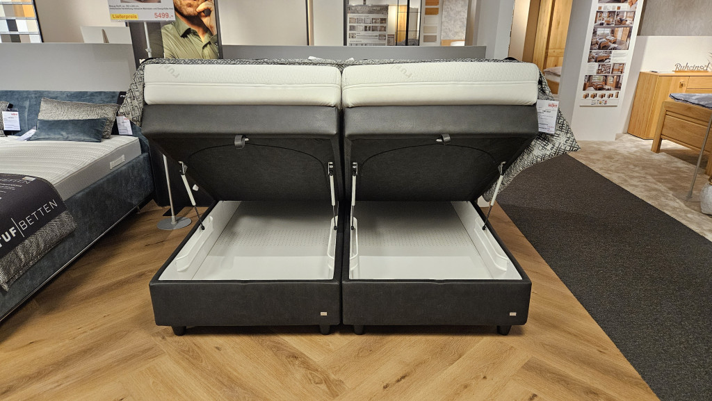 ca. 180 x 200 cm, Bezug: 06510, Boxspring-Unterbau QLX-BKA mit Stauraum durch Bettkasten und vier Schlafkomfortebenen, Kopfteil, 4 Paar Füße S schwarz, 1x 5086 BF 1 H2,