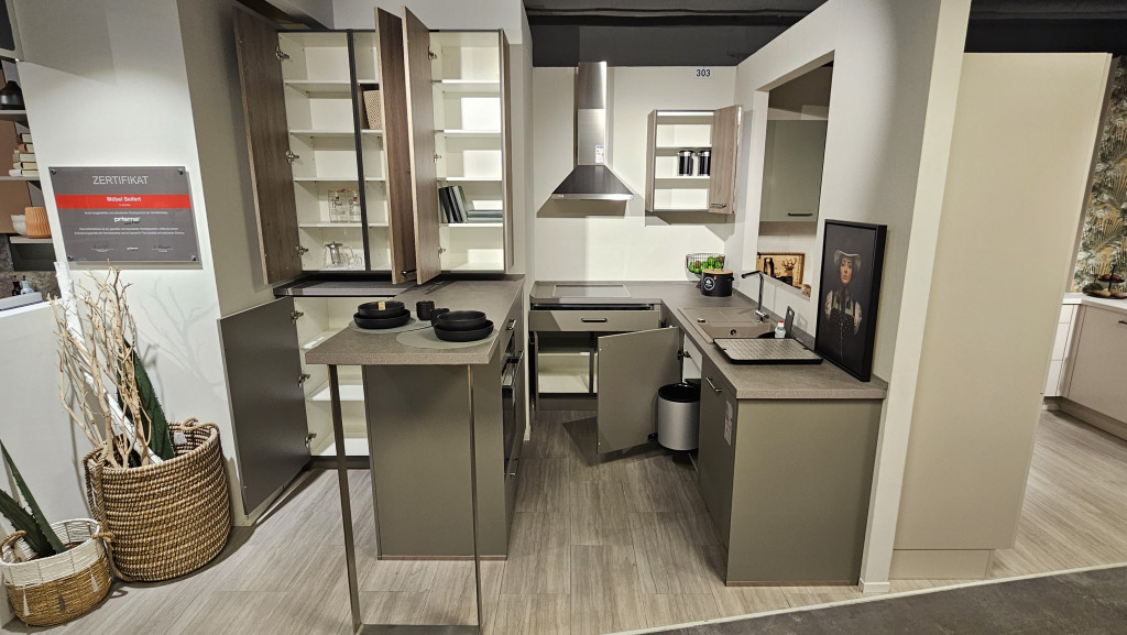 Easytouch, Frontausführung: Lacklaminat, Taupegrau ultramatt, Griff: Metallgriff Schwarz gebürstet, Korpusfarbe: Schiefergrau, Sockelfarbe: Taupegrau ultramatt, Arbeitsplattendekor: Basalt Taupegrau Nachbildung, Sockelhöhe: ca. 150 mm.,