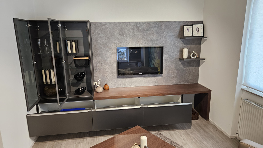 Frontausf.: Glas-Optik Titanio matt, Griff: Edelstahlfarbig, Korpusfarbe: Schiefergrau, APL-Dekor: Rusty Plates Nachbuldung,