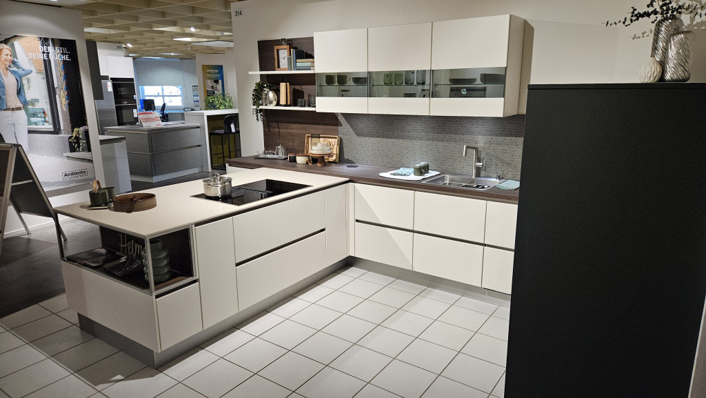 Front: Lack, Magnolia matt, Griff: Griffmulde Edelstahlfarbig, Korpus: Magnolia matt,