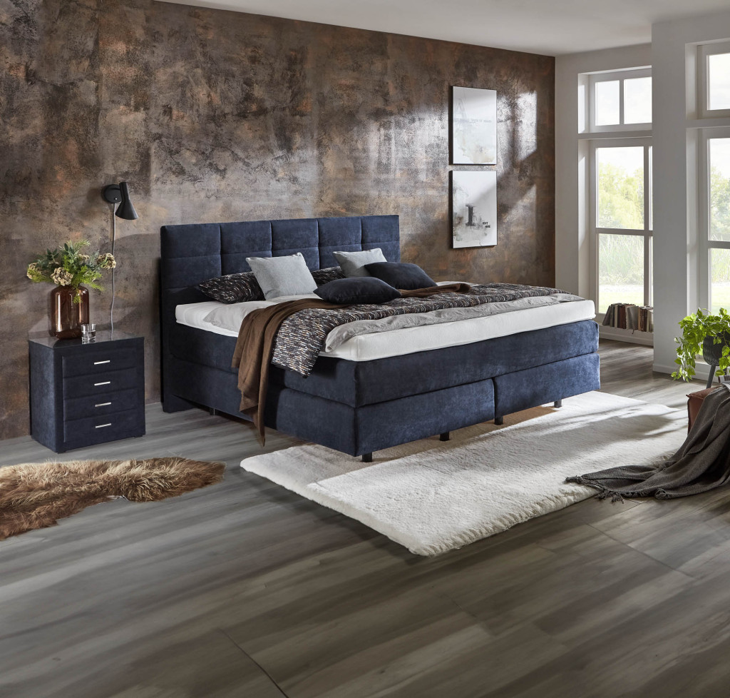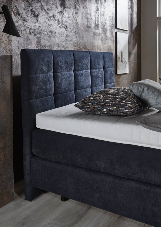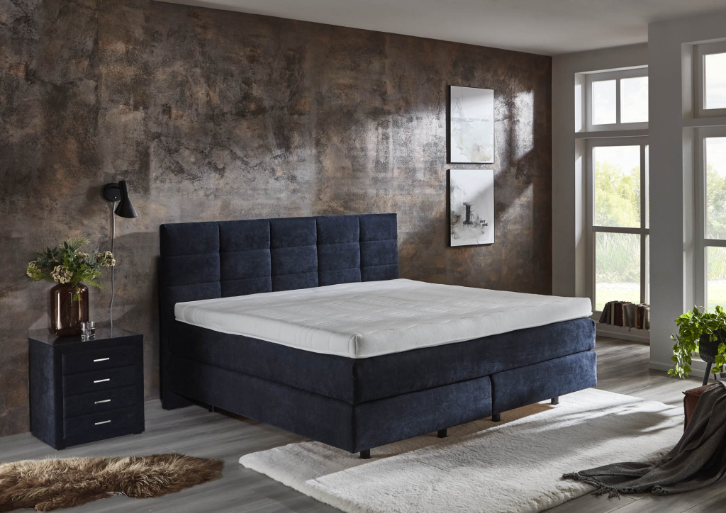 Microfaser, Nutzschicht 92 % Polyester, 8 % Nylon, Grundschicht 100 % Polyester, Farbe Marine, Füße Schwebeoptik, Unterbau Taschenfederkern, 2 x 7-Zonen-Taschenfederkern-Matratze, Härtegrad & Härtegrad 4 Bezug Stoff, geteilt, Topper Gel, Bezug Drell, geteilt, Liegefläche 180 x 200 cm