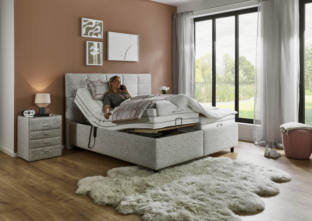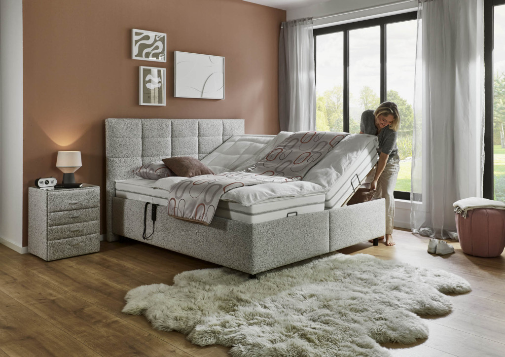 Stoff, Farbe beige, Füße Schwebeoptik, 10 cm, Kopfteil, Rücken unecht, Unterbau, Matratze links 1000-Federn Taschenfederkern-Matratze H2, Matratze rechts 1000-Federn Taschenfederkern-Matratze H3, Bezug Drell, geteilt,Liegefläche 180 x 200 cm, Stellmaß BHT 191/125/215 cm, Liegehöhe 62 cm