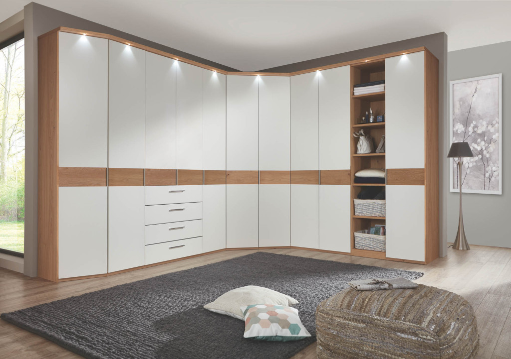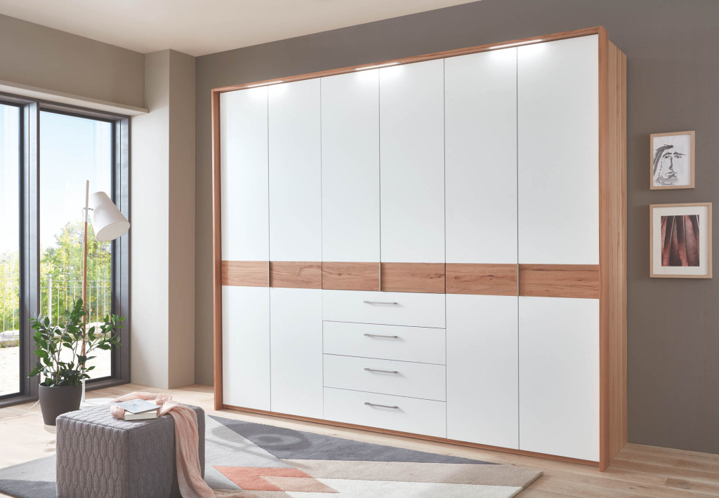Front mit Bauchbinde, Front Lack weiß, Bauchbinde Wildeiche Riffelholz, Korpus Wildeiche furniert, Griffleisten Wildeiche furniert, 2-türig, mit Dämpfungsbeschlag, Kranzleiste 19mm ohne Beleuchtung, Aufteilung 90/60/60/90 cm, BHT ca. 301/230/68 cm