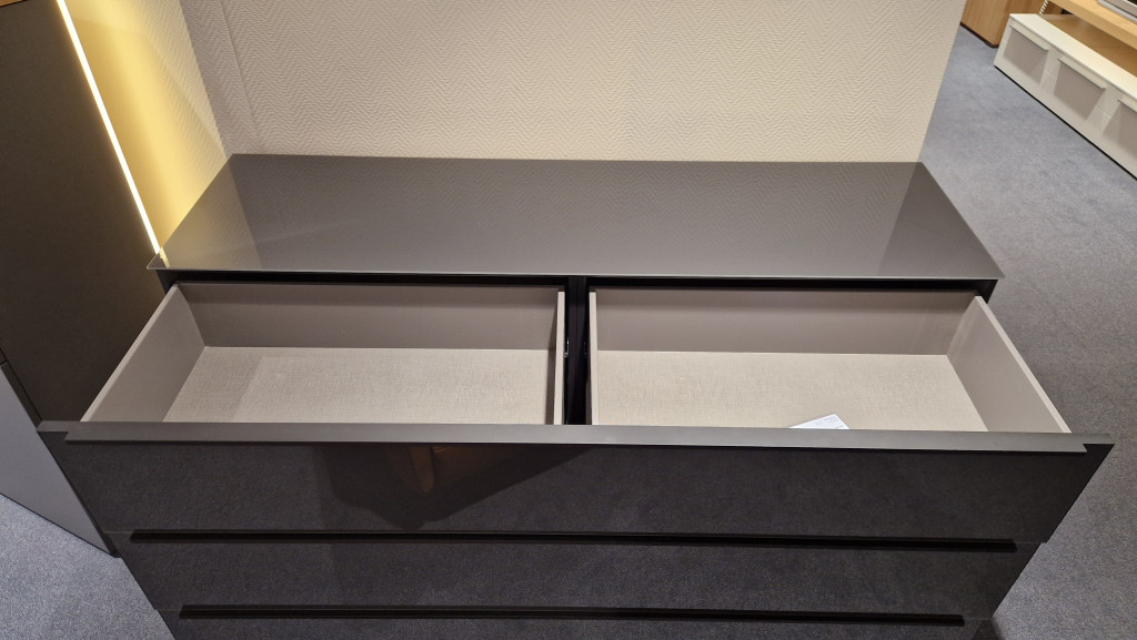 Schubkästen: mittig unterteilt, Front: G98 Basaltglas PG. 3, Korpus: L1 Basalt, Innenfarbe: X1 Leinenoptik Twist, Griffe: 193K Griffleiste kurz- 324 schwarz, Füße: 324 Schwarz- 102 rund, Vollauszug gedämpft,