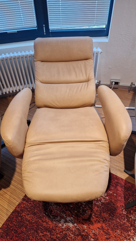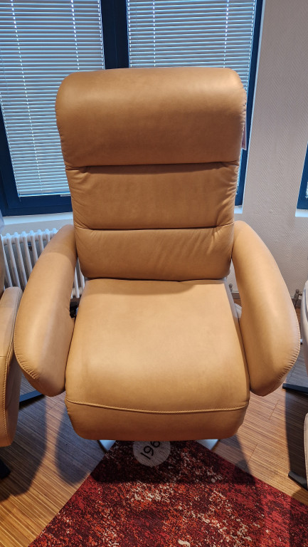 Leder Vivre honey, Fuß V6 - Drehteller Metall linsenförmig, Sitzhärte: F2 - weich, Ergonomie: Medium, Inkl. 3 motorische mit Aufstehhilfe und Kopfpolsterverstellung, ca. SH=47cm., ST=52cm., RH=114cm., Liegelänge ca. 178cm.