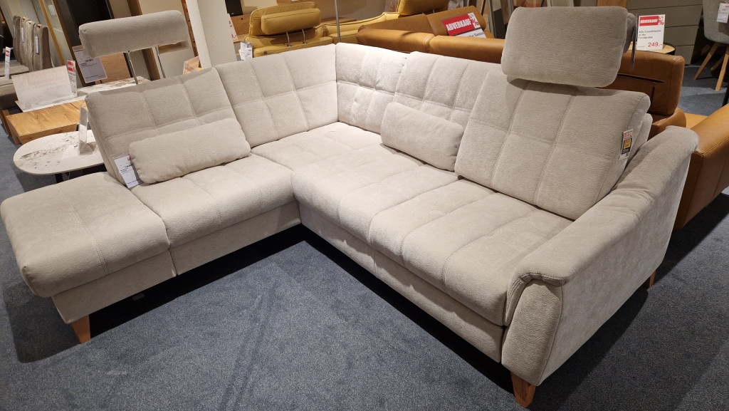 Bezug: Rimini natur, Füße: Massivholz Wildeiche, Sitz: Kaltschaum, Doppelsteppnaht mit Kotrastfaden, Inklusive: Anstellhocker, aufklappbar, mit Sitztiefenverstellung, mit Querschläfer-Funktion, Premium Kopfstütze Inklusive Kopfstütze und 2x Nierenkissen