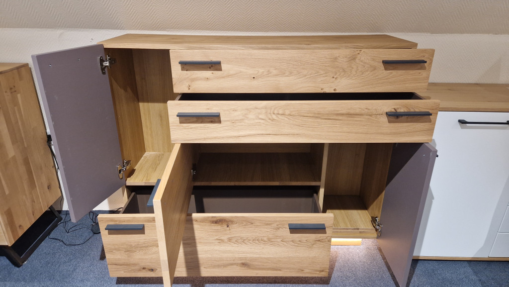 Salzkammergut Alteiche natur, Akzent: Lack Terra, Nr. N3599-LTR, 3 Türen, 3 SchübeInklusive Beleuchtung ca. B/H/T 128/106/38 cm.