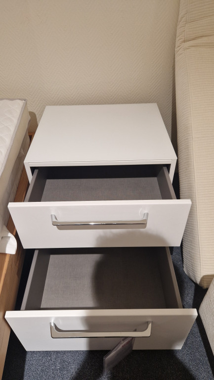 Frontfarbe: Polarweiß, Korpusfarbe: Polarweiß, Griffausführung: Bügelgriff, Grifffarbe: chrom, Schubkasteninnenfarbe: Leinenoptik Twist, Fußfarbe: schwarz, mit 2 Schubkästen,