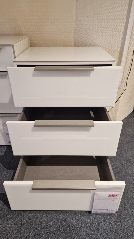 Frontfarbe: Polarweiß, Korpusfarbe: Polarweiß, Griffausführung: Bügelgriff, Grifffarbe: Edelstahl gebürstet, Schubkasteninnenfarbe: Leinenoptik Twist, Fußfarbe: schwarz, mit 3 Schubkästen,