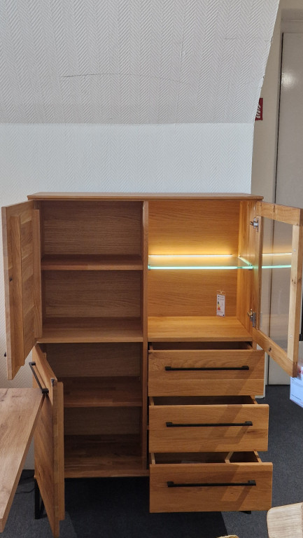 Charakter-Eiche massiv, gebürstet/geölt,Untergestell und horizontale Design-Bügelgriffe in Alteisen geschwärzt, Inklusive: LED Glasbodenbeleuchtungca. B/H/T 101/149/42