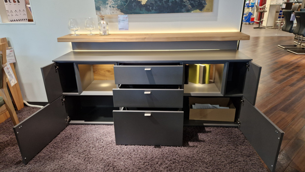 Lack schiefergrau matt, Eiche rustico hell geölt, 2 Raster, Inklusive: LED Beleuchtung, Ambiente Beleuchtung, Aufsatzkonsole mit Beleuchtung B/H/T ca. 180/71/43 cm.