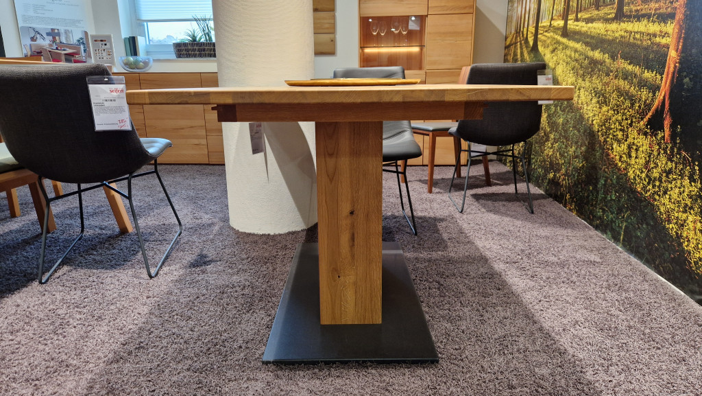 Rustikale Asteiche Hartwachsöl natur geschliffen, feste Tischplatte,ca. 130 x 95 cm., H=76 cm., Plattenstärke ca. 3 cm.,Holzsäule mit Granitnodenplatte schwarz