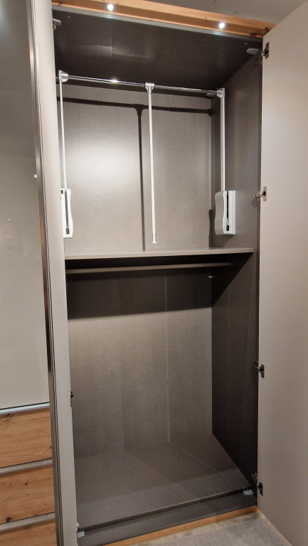 Kleiderlift, ausschwenkbar, H=87cm, Kleiderbügelhalter, Schubkasteneinsatz WOODLINE, 2 Auszüge mit Holzfront, Griff: 151 x 301 Alu-matt, ca. B/H/T 98x41x50 cm, Vollauzug f. Schubkasteneinsatz, Maße: ca.B=282 H=240 T=62 cm