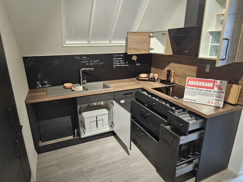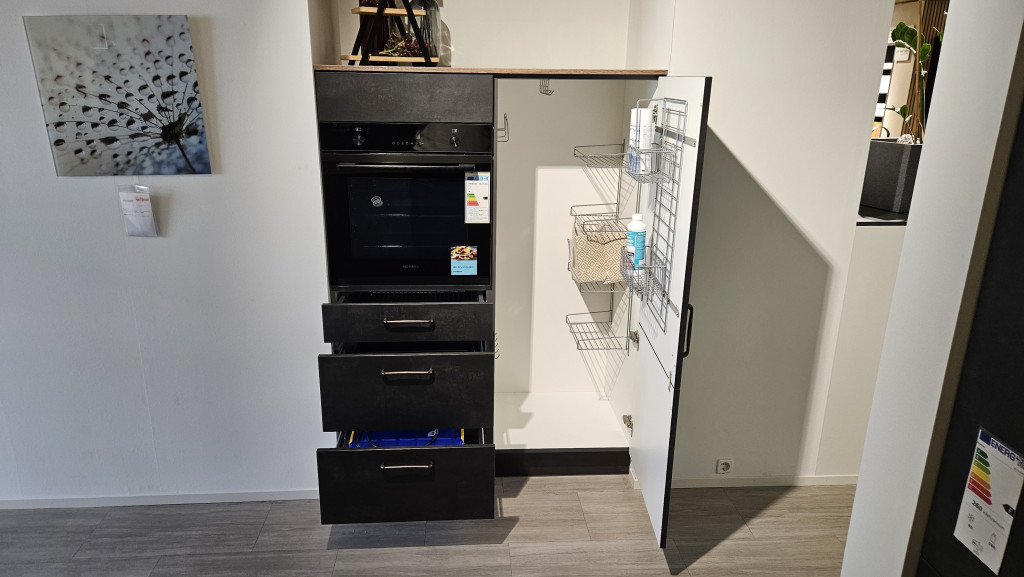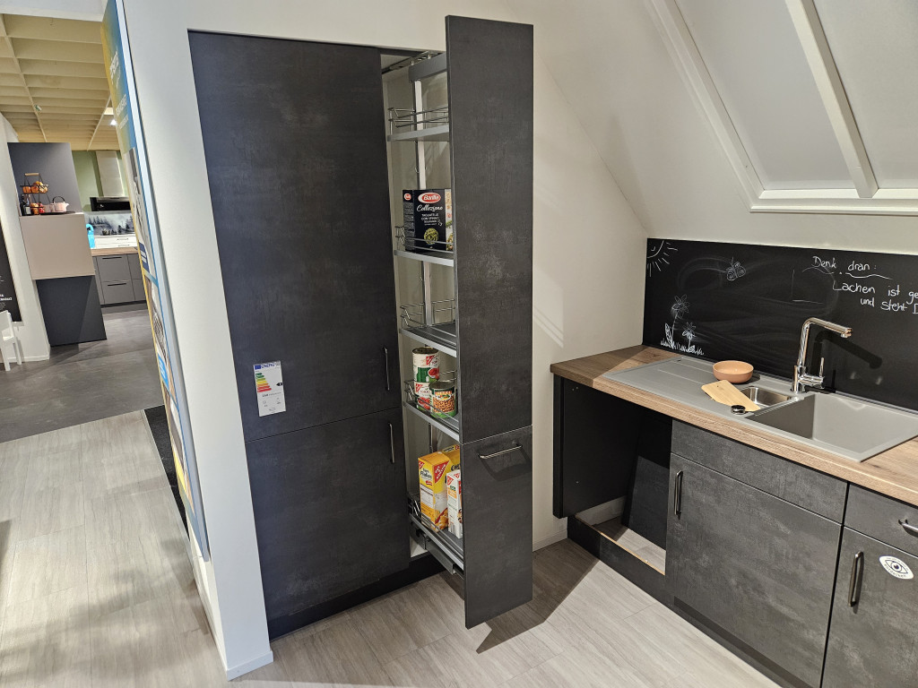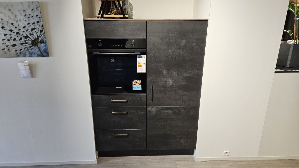 Front: Schwarzbeton Nachbildung, Griff: Metallgriff schwarz gebürstet, Korpusfarbe: Schiefergrau, Sockelfarbe: Schwarzbeton Nachbildung, Arbeitsplattendekor: Eiche Havanna Nachbildung, Sockelhöhe: ca. 150mm.,