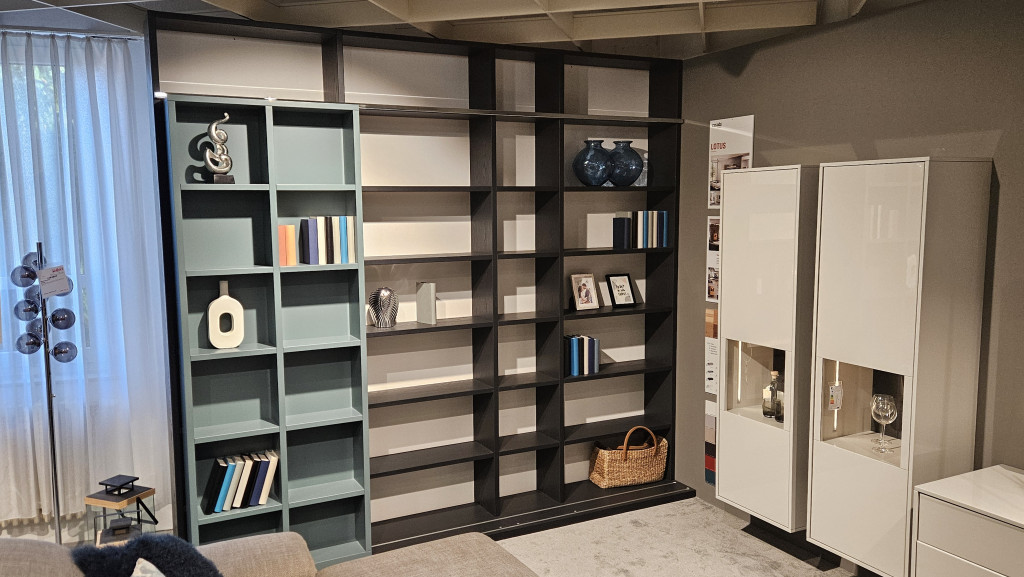 Korpus: Eiche graphit, Frontfarbe: Lack ocean, PG. 2, Schieberegal in Lack ocean, Rückwand in Lack ocean,Führungsschiene in chrom, best. aus: 5x 34002, 24x 34010, 8x 34007, 76309, ca. B=277 H=250,9 T=45,6 cm.