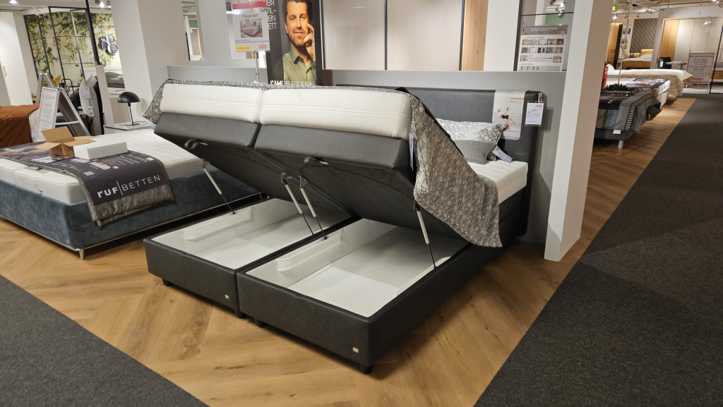ca. 180 x 200 cm, Bezug: 06510, Boxspring-Unterbau QLX-BKA mit Stauraum durch Bettkasten und vier Schlafkomfortebenen, Kopfteil, 4 Paar Füße S schwarz, 1x 5086 BF 1 H2,